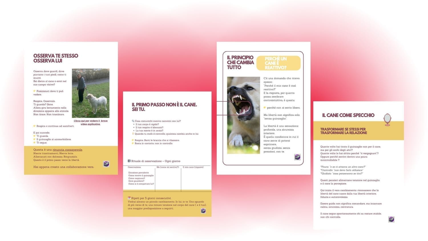 Questa guida è frutto di enormi investimenti in formazione, centinaia di test ed errori fino ad arrivare a questo metodo, unico nel suo genere, che si basa su un approccio etologico ,cognitivo e sistemico, che integra la crescita personale e l'autosservazione con l'utilizzo del Tellington TTouch®.